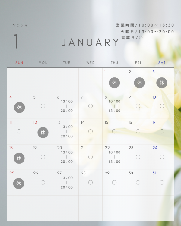 【2026年1月営業日カレンダー】新年のご予約はお早めに!